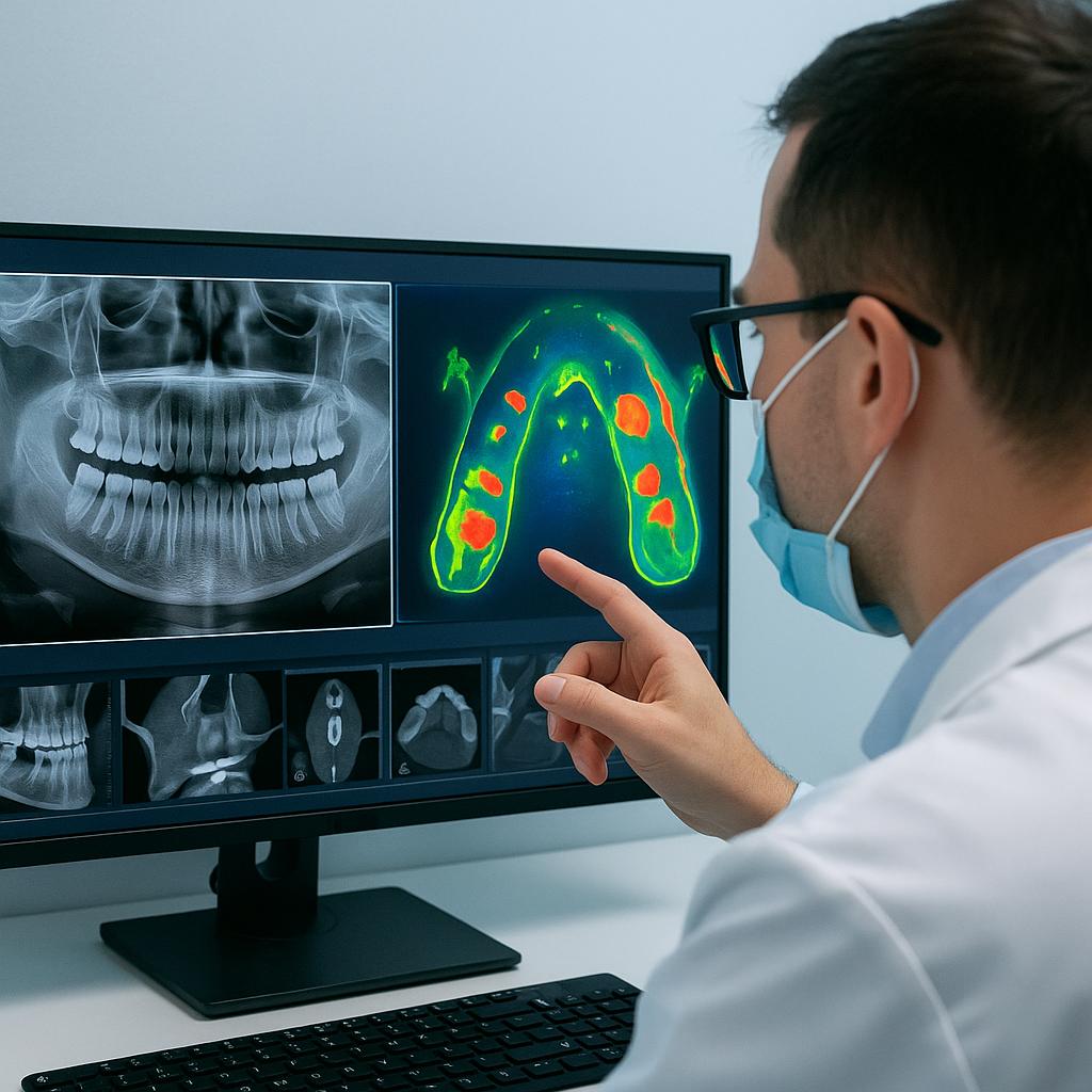 Кроме того, объём данных растёт: цифровые ортопантомограммы, 3D-КТ, интраоральные сканы, фотопротоколы. Анализ такого массива вручную требует времени. Здесь и вступает в работу искусственный интеллект — не как замена врачу, а как дополнительный «глаз», который не устает и видит закономерности, скрытые от человека.