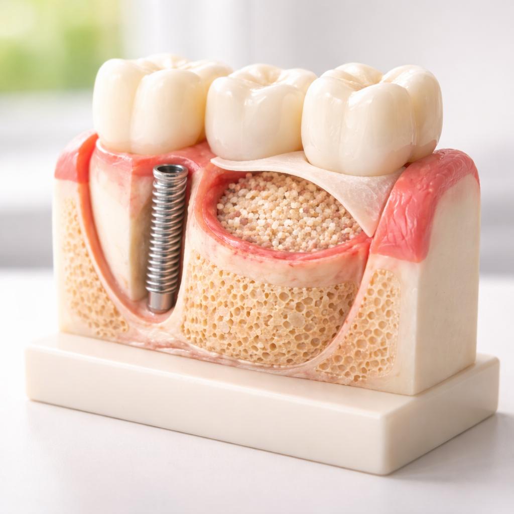 Сохранение лунки после удаления зуба. Если врач заранее видит риск убыли кости, в область удаленного зуба сразу вносится костный материал. Это помогает уменьшить последующую атрофию.